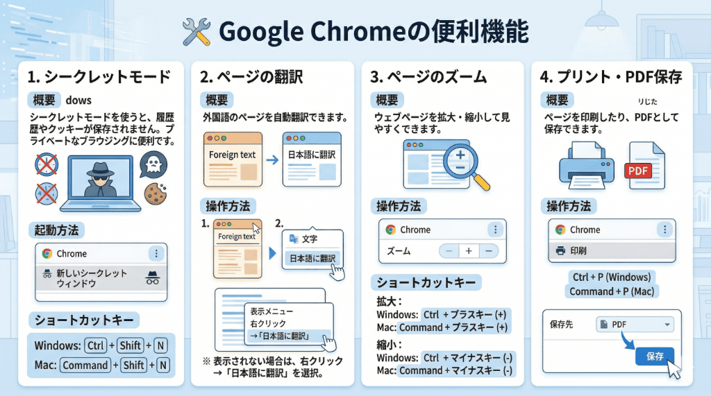 • 概要: シークレットモードを使うと、履歴やクッキーが保存されません。プライベートなブラウジングに便利です。