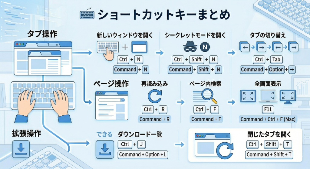 • 閉じたタブを開く: Ctrl + Shift + T / Command + Shift + T